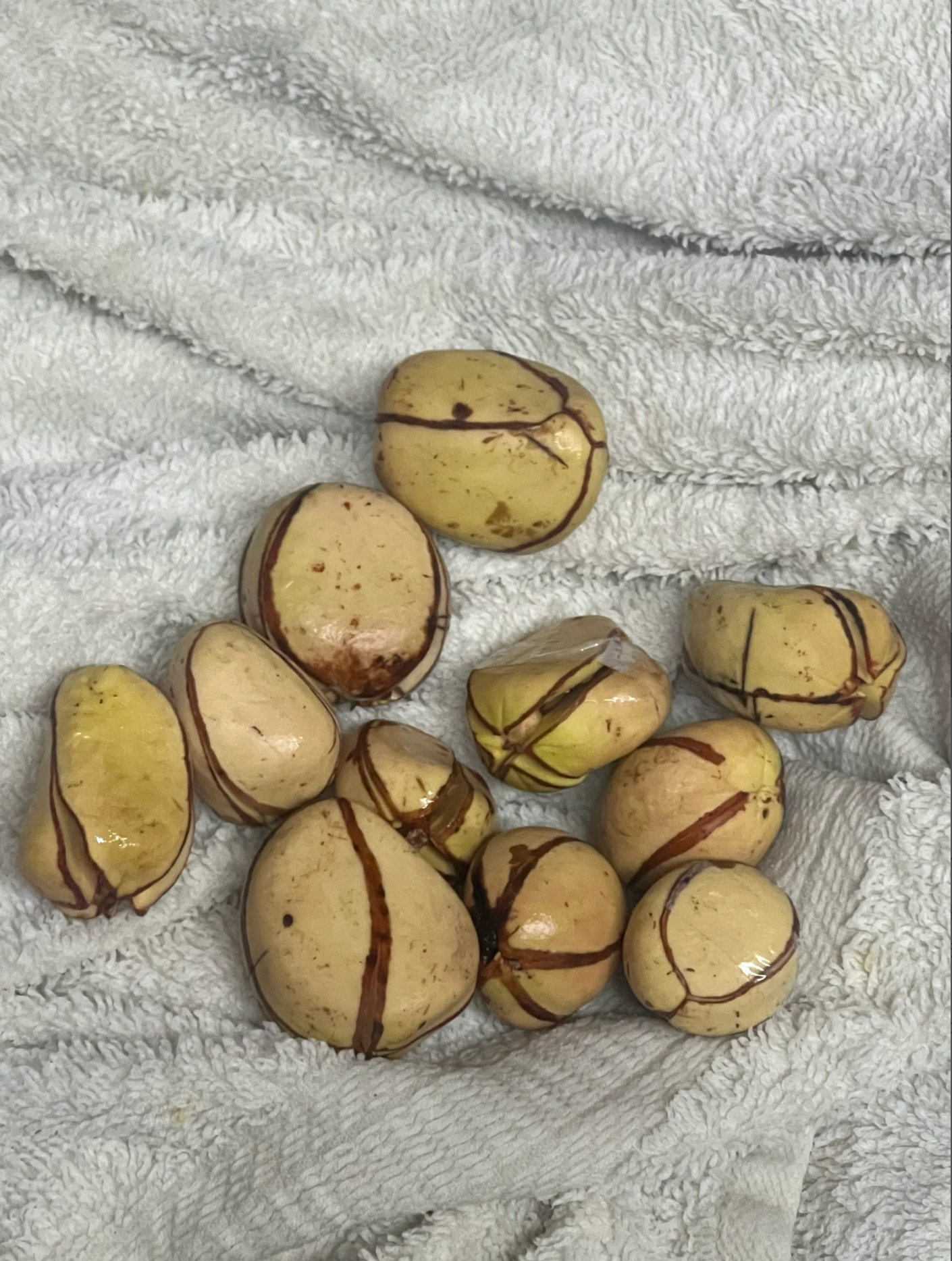 Our obi is fresh. Obi Kola is a seed that grows roots. As the root emerges from the center of the kola nut pushing the lobes a part. So we tape the obi to keep the lobes together. This is done because as obi kola begins to sprout its root the lobes begin to come apart.