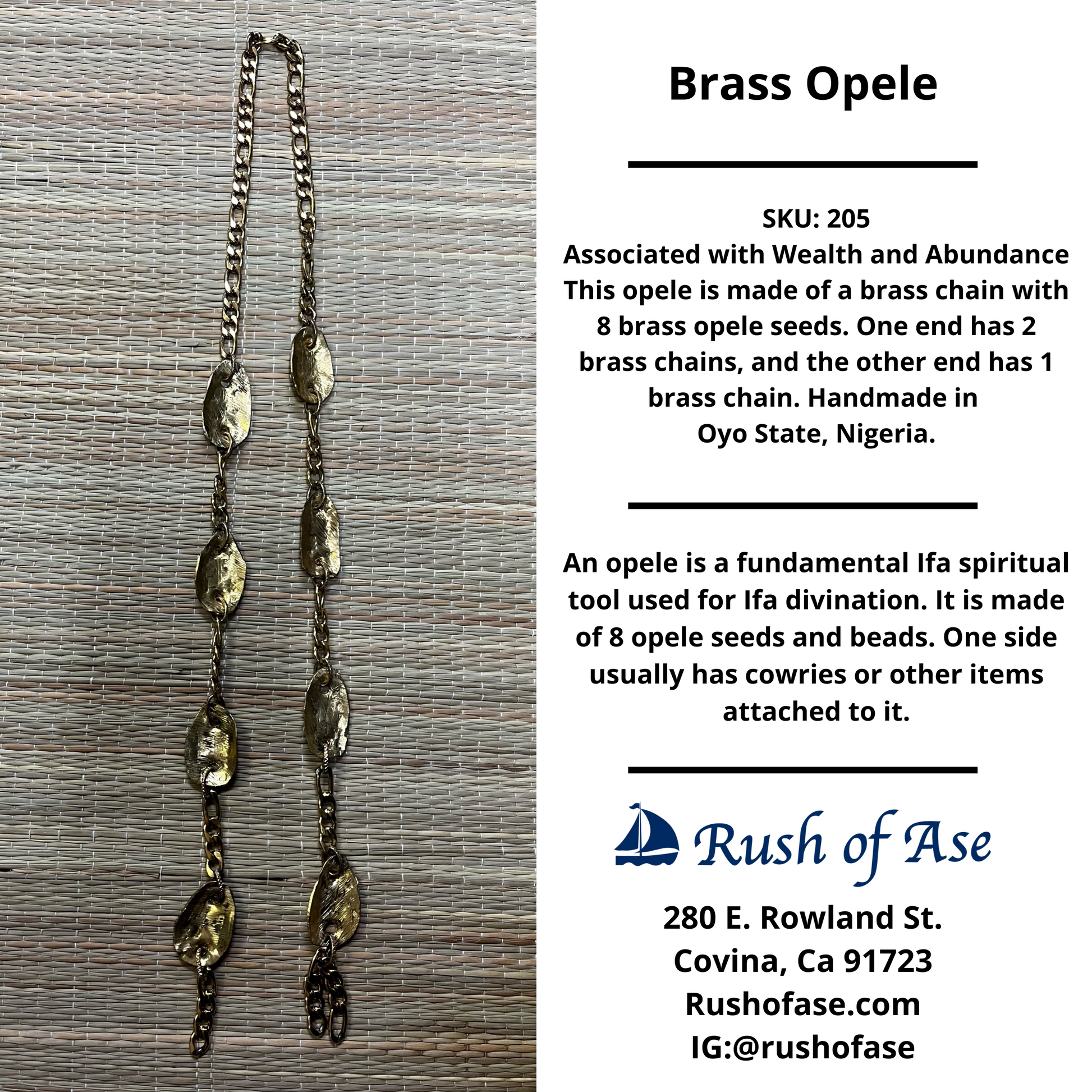Brass Opele (SKU 205) – Brass chain with 8 brass seeds. Length 30.5" (15.25" folded). Seed size: 1.375" L x 0.75" W. Associated with wealth/abundance.