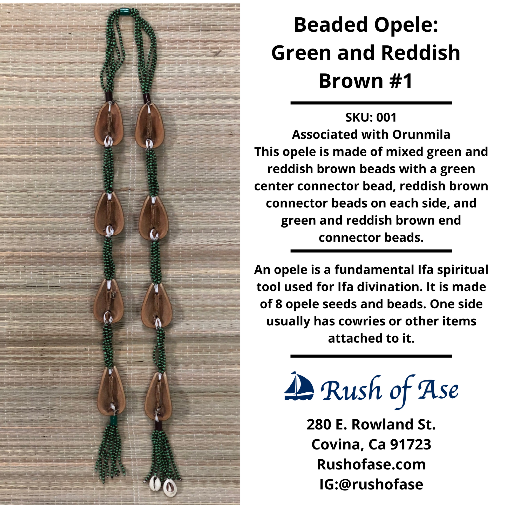 Green & Reddish Brown Beaded Opele #1 (SKU 001) – Mixed green/reddish brown beads, green center connector bead, reddish brown side connectors. Associated with Orunmila.