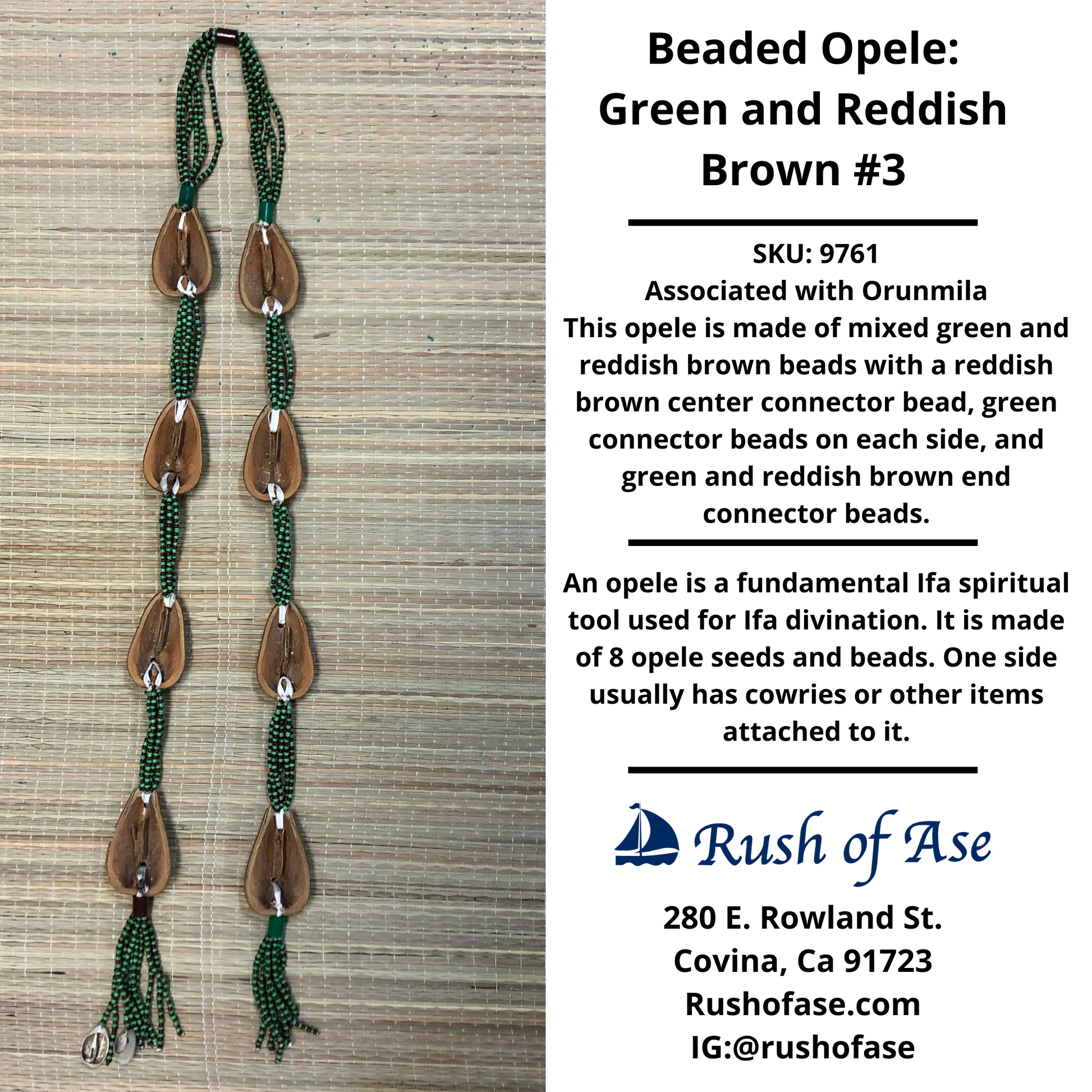 Green & Reddish Brown Beaded Opele #3 (SKU 9761) – Mixed green/reddish brown beads, reddish brown center, green side connectors. Associated with Orunmila.