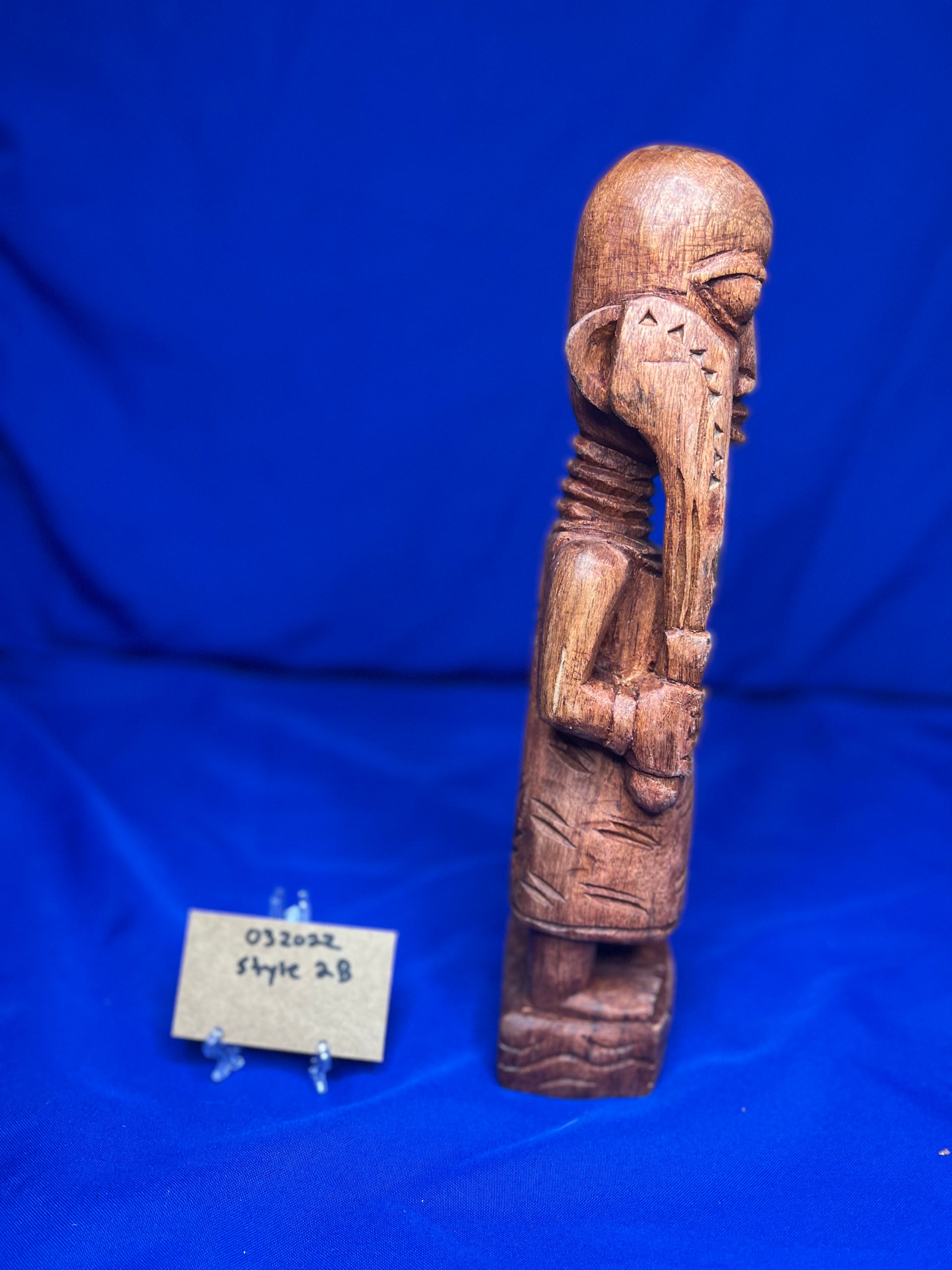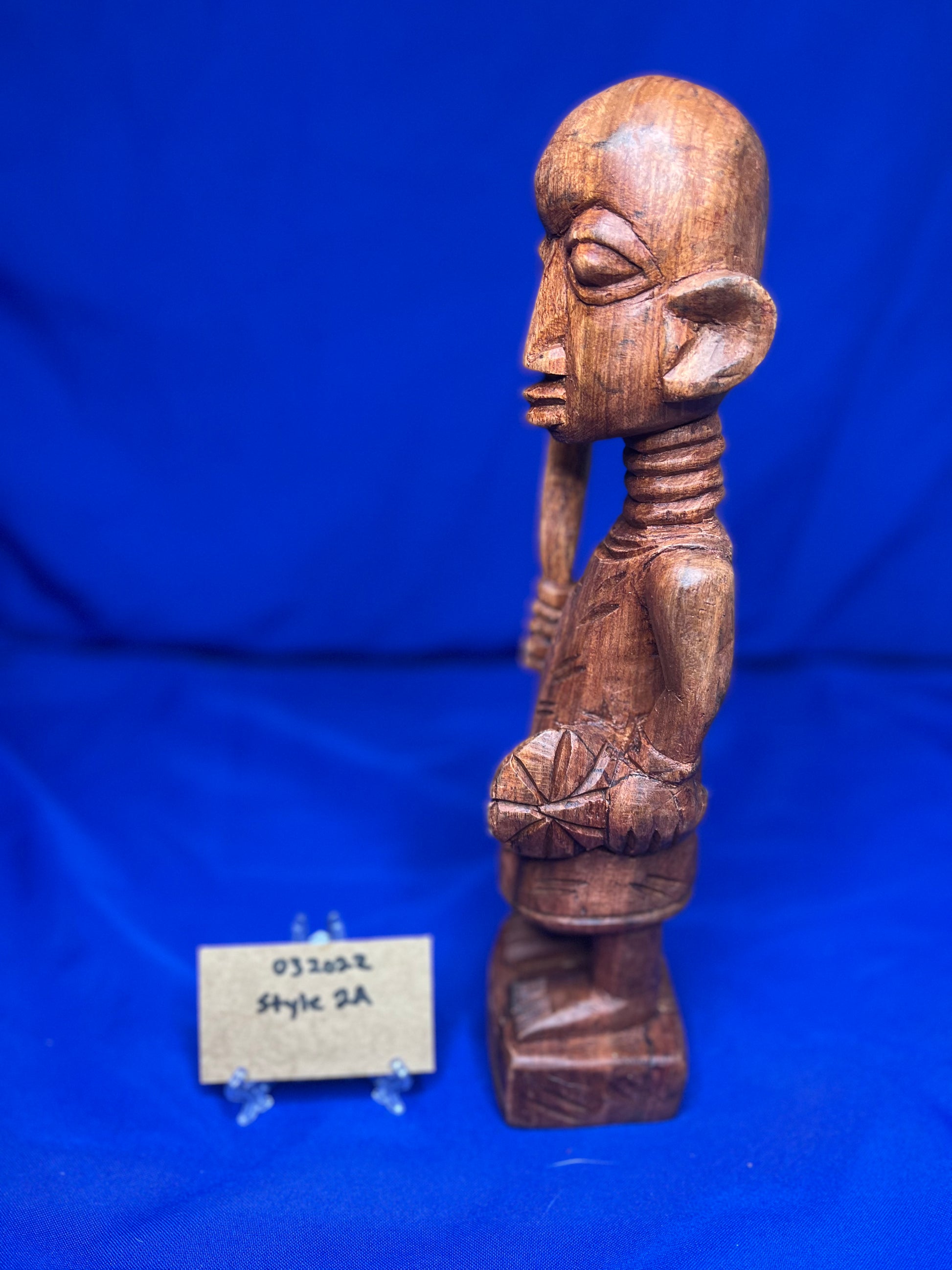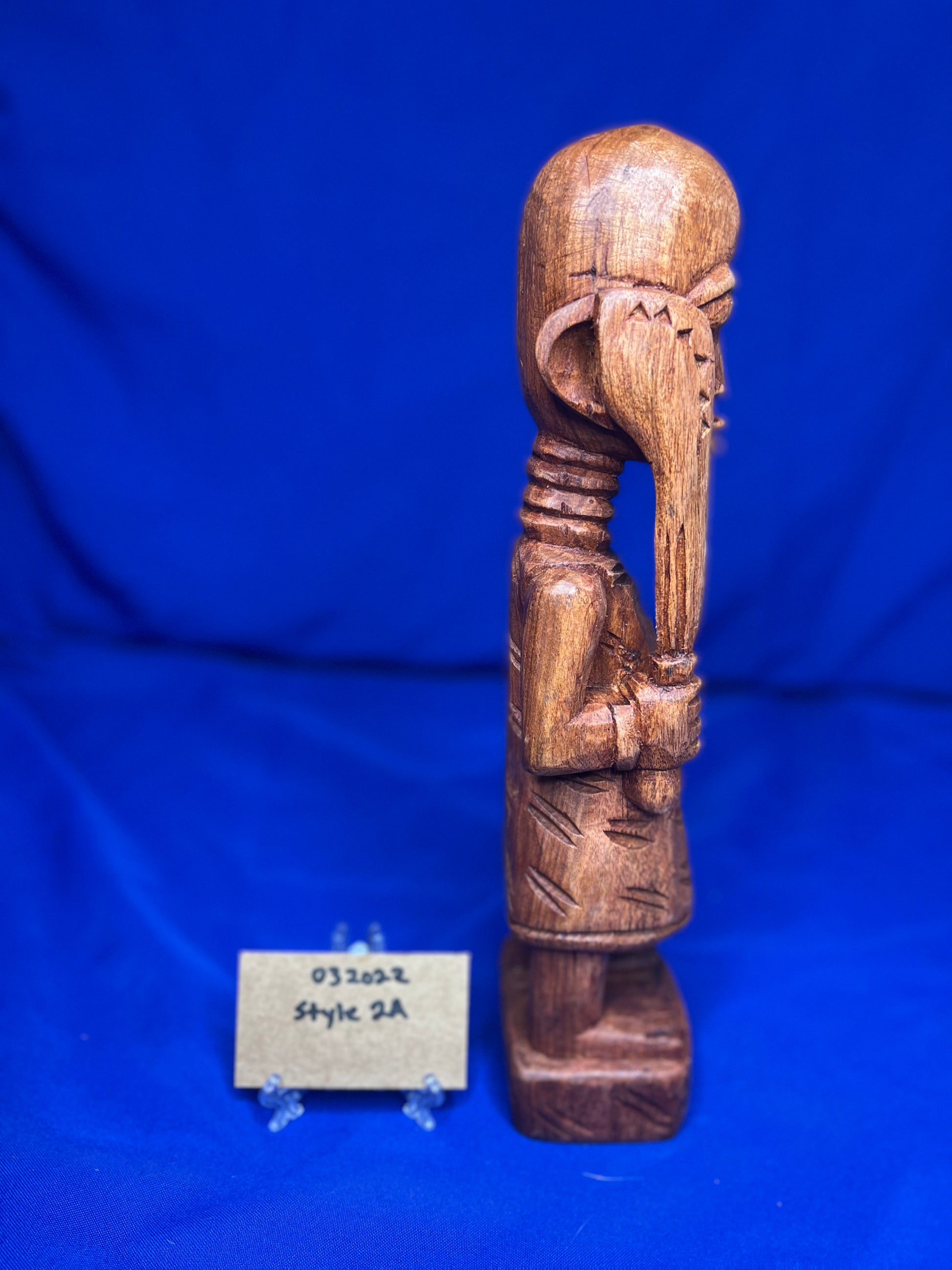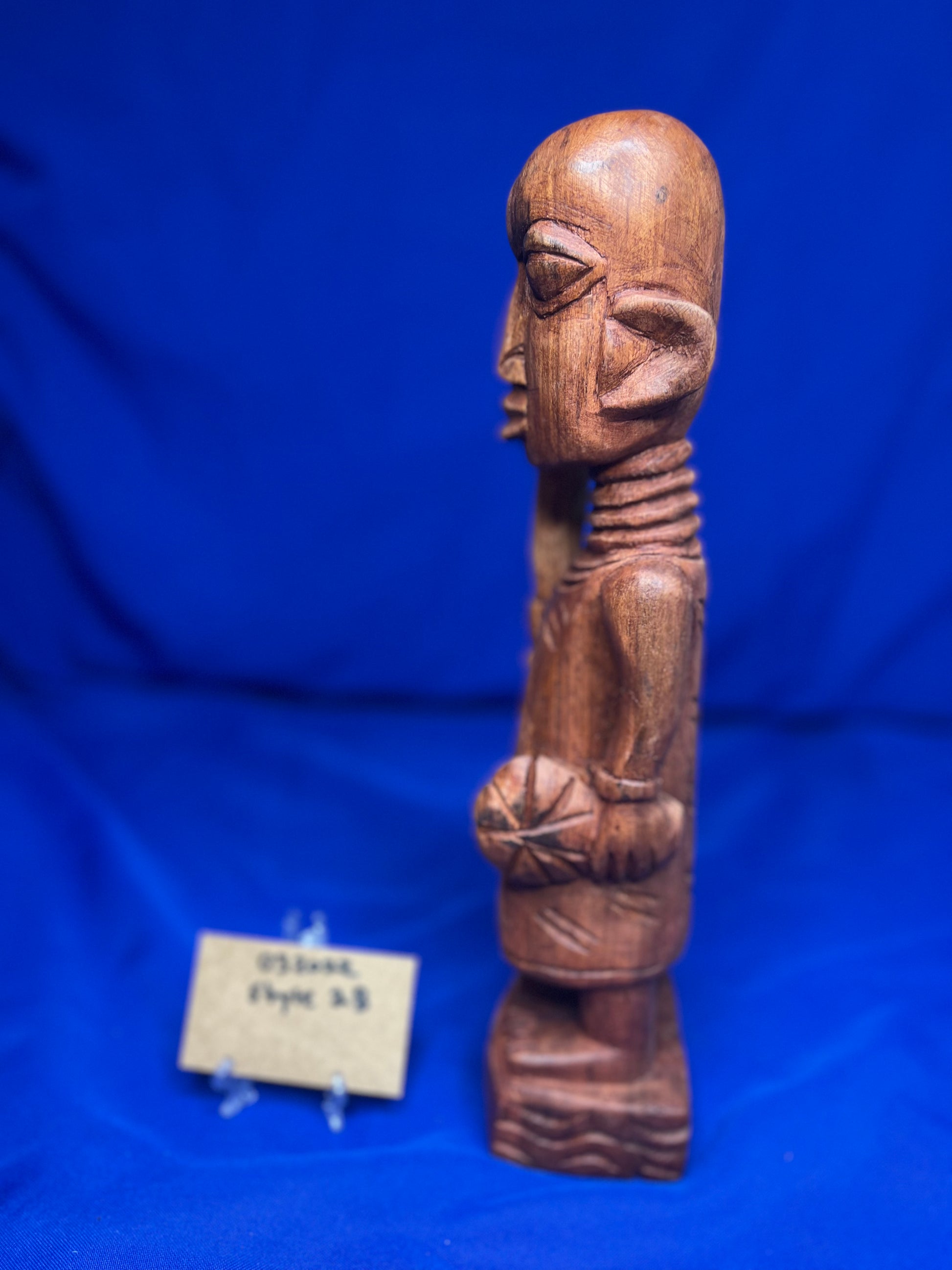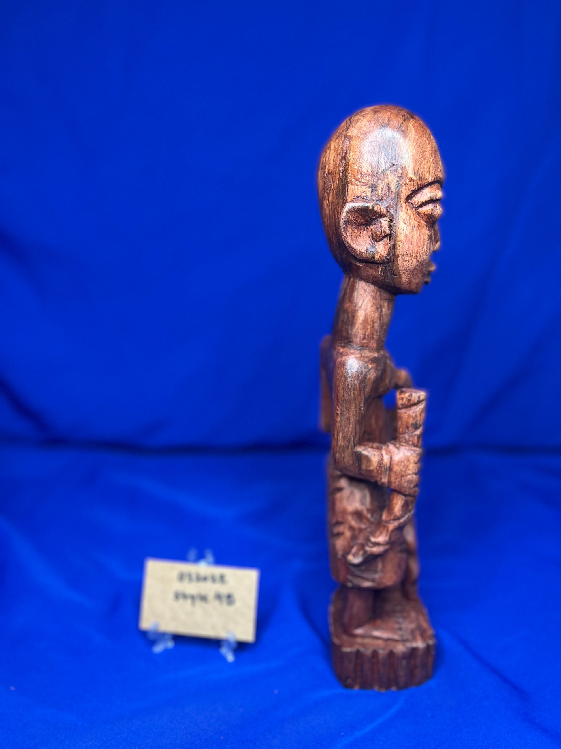 This wooden Esu series highlights Esu ability to communicate through the opele, music, and his ability to bring peace or war. He is typically associated with the The ìyáàlù (mother) bàtá drum, but he is also known to play the flute, Esu Onikondo (Flute player).
