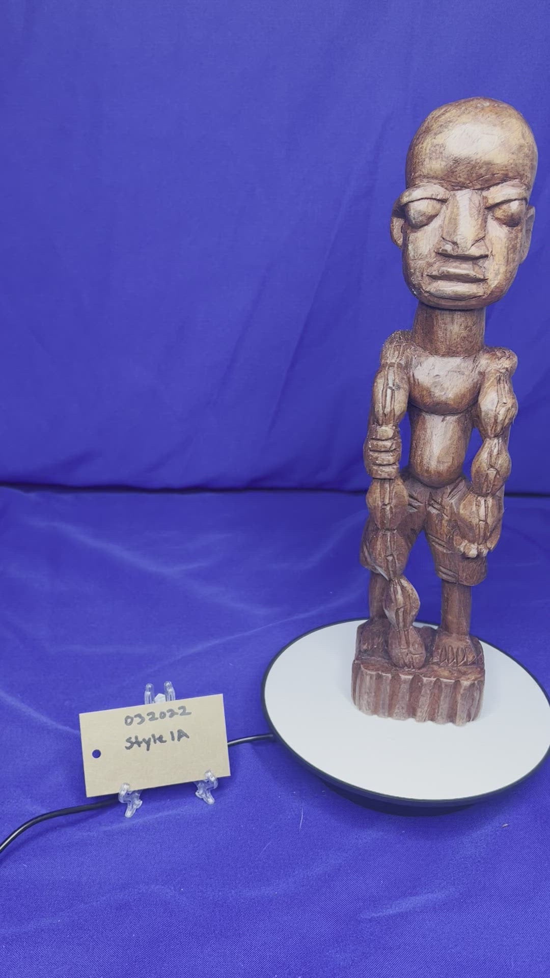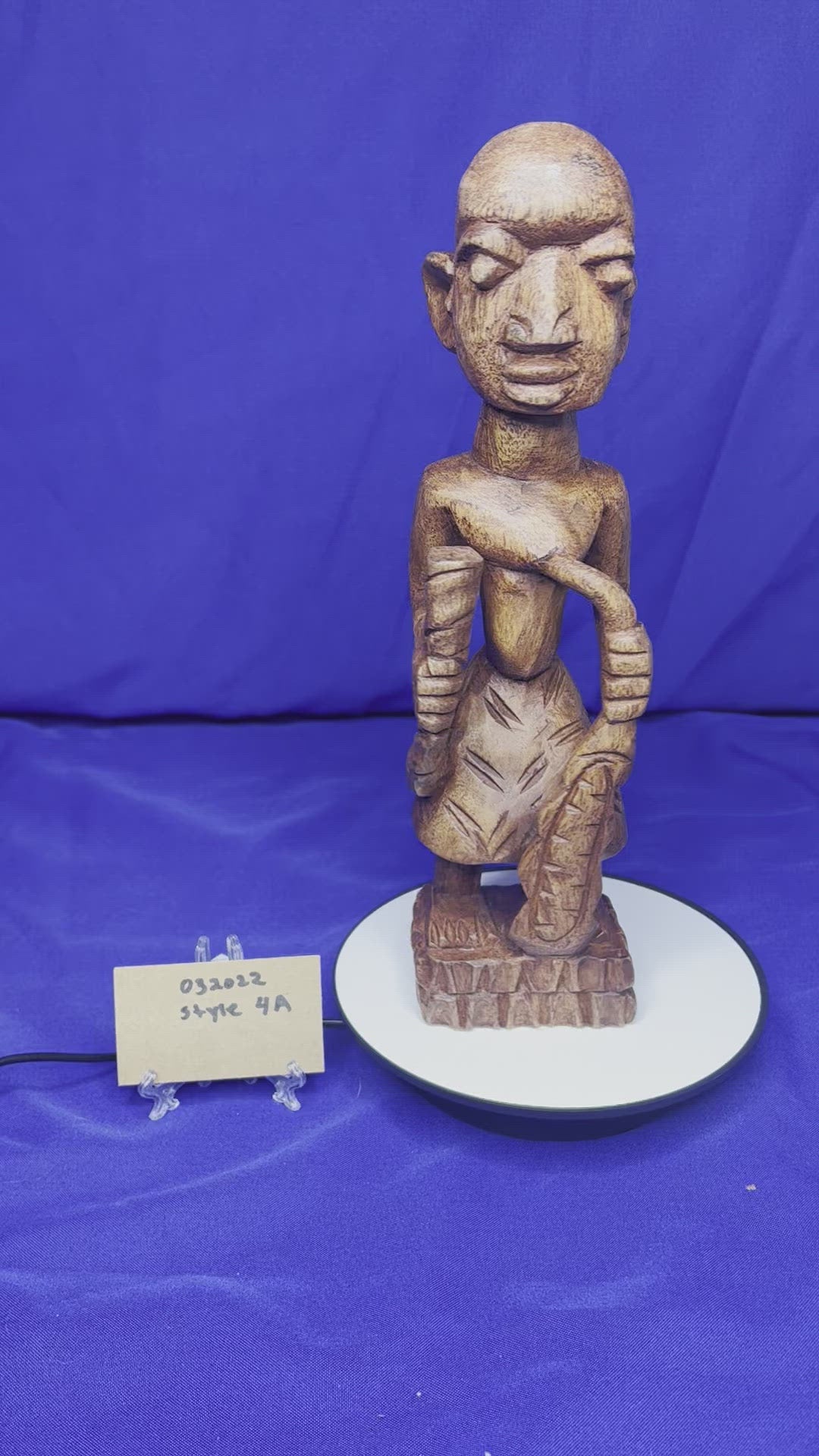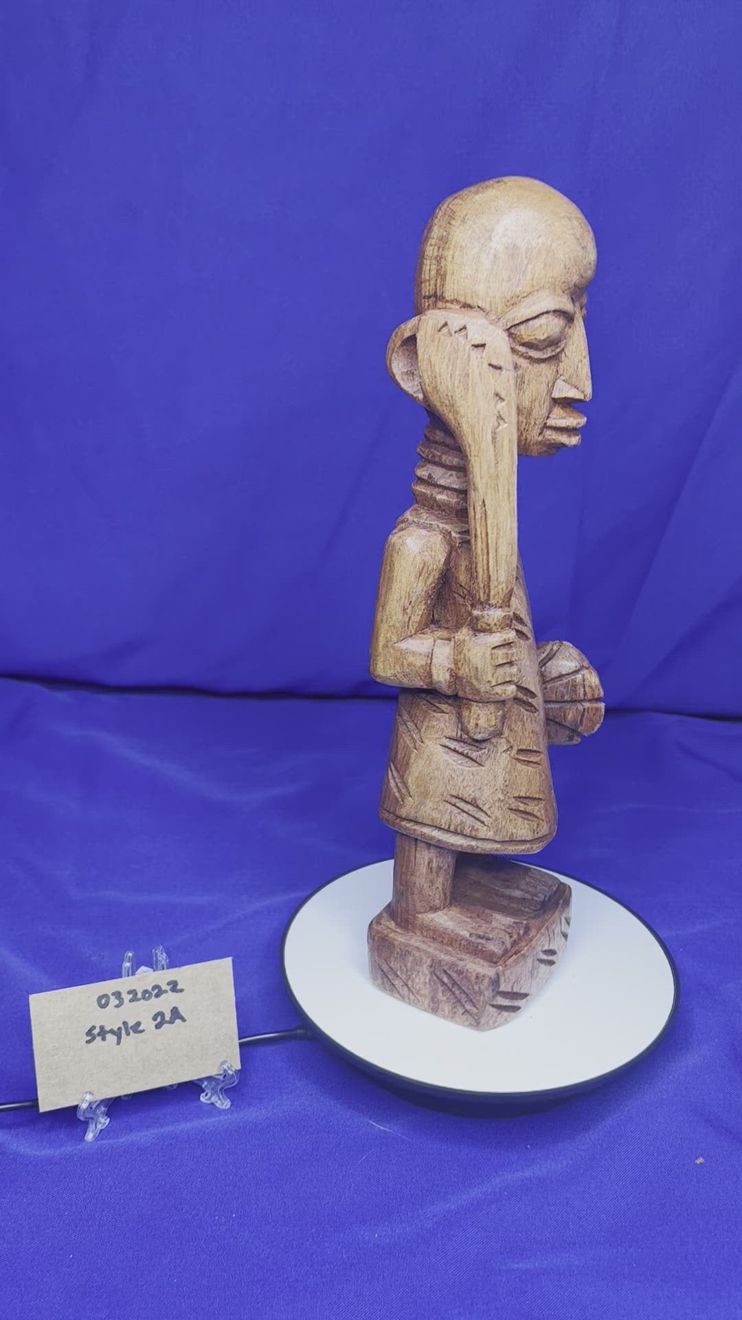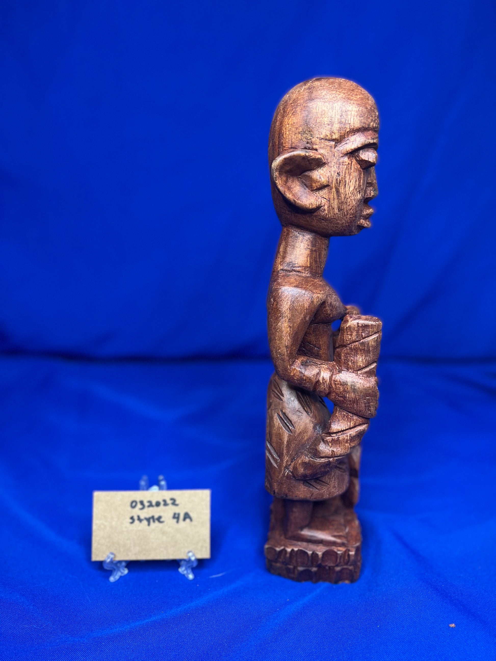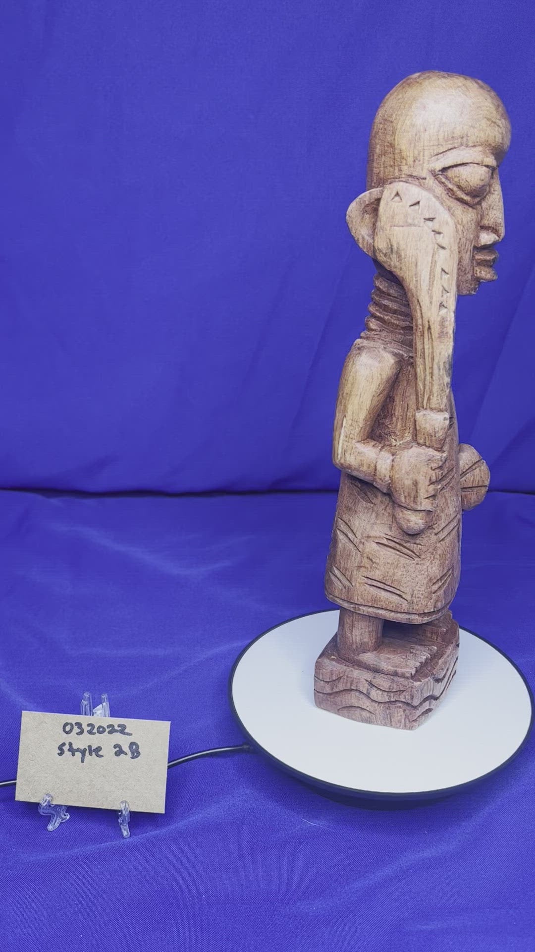 This wooden Esu series highlights Esu ability to communicate through the opele, music, and his ability to bring peace or war. He is typically associated with the The ìyáàlù (mother) bàtá drum, but he is also known to play the flute, Esu Onikondo (Flute player).