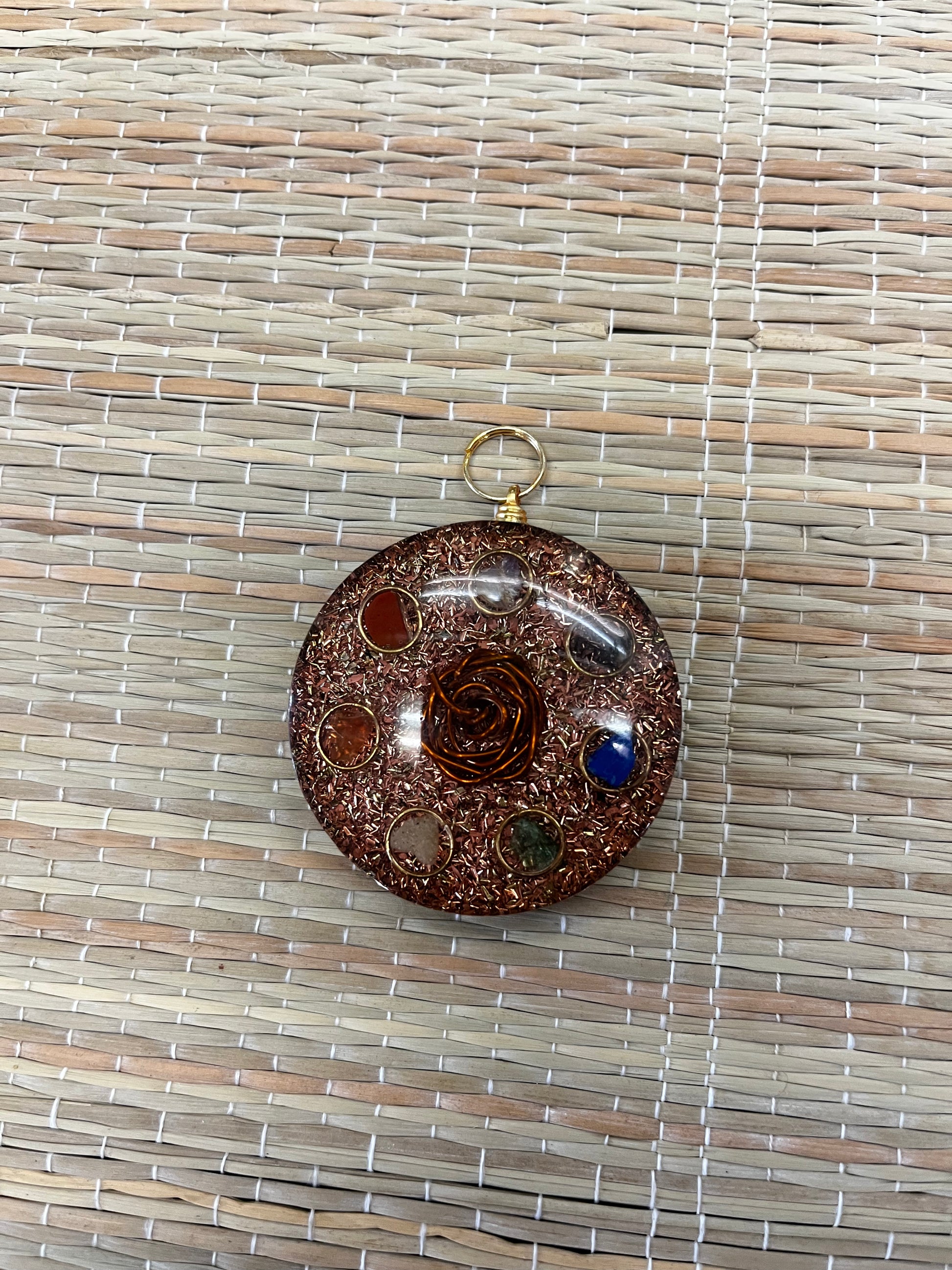 Chakra Stones Orgonite pendant with copper coil. These orgonite pendants has a layer of copper at the bottom with chakra stones at the top along with the copper coil. These orgonite pendants are made from natural chakra stones.